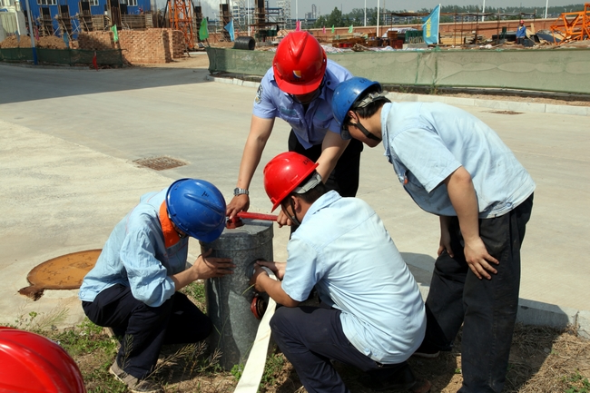 “演习开始!”随着该公司生产副总经理李继鹏一声令下,消防演练监督人员迅速将事先准备好的易燃物(置于铁盆的沾满煤油的抹布)点燃,各抢险队员立即依据应急预案迅速行动,根据各自分工协作配合,正确使用室外消防栓和灭火器、远程启动消防水泵灭火,有条不紊地进行消防抢险工作,最终圆满完成抢险演练。